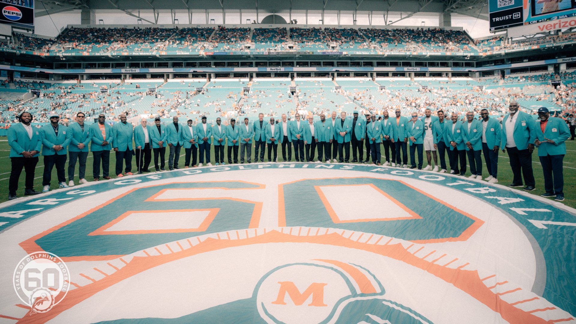Auch wenn es in den letzten Jahren nicht mehr viel zu feiern gab, die Ära des „Perfect teams“, die „Regierung“ von Dan Marino und dessen Jagd nach einem Ring sowie die Zeitspanne danach und das Warten auf einen weiteren Playoff-Sieg – das alles (und viel mehr) macht die Miami Dolphins und ihre Strahlkraft mit aus. Sechzigste Football-Saison (deswegen auch: nicht 60 Jahre, sondern die 60. Saison der Dolphins wird gefeiert), ein insgesamt positiver record, zwei SB-Siege, 13 AFC East division championships, fünf AFC titles, 25 playoff appearances, eine perfect season, drei Nummern retired, insgesamt 17 Personen in der Hall of Fame (es werden hoffentlich kurzfristig mehr werden) – die Miami Dolphins haben schon einiges zu bieten und sind fester Bestandteil der amerikanischen Football-Liga. Vielleicht gibt es in den nächsten Jahren dann auch mal wieder etwas mehr zu feiern als zuletzt…